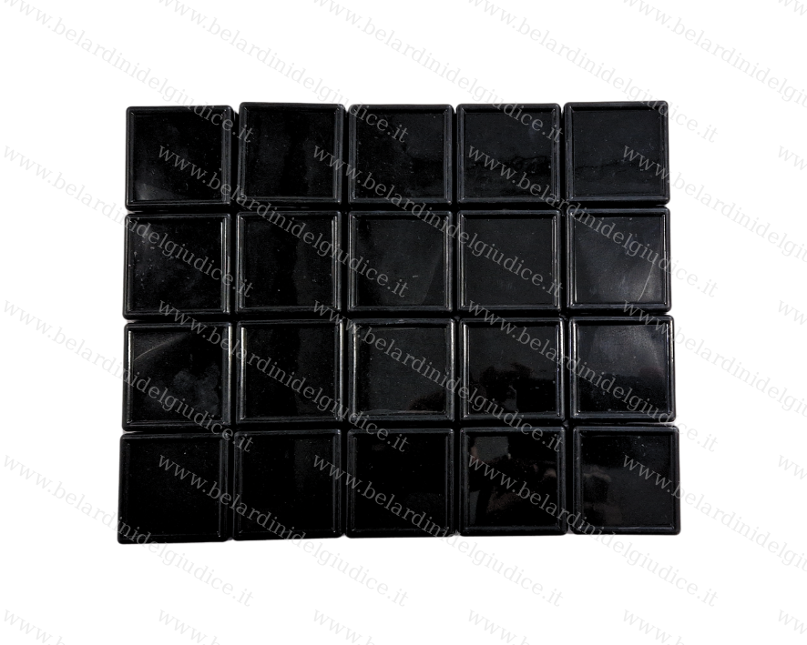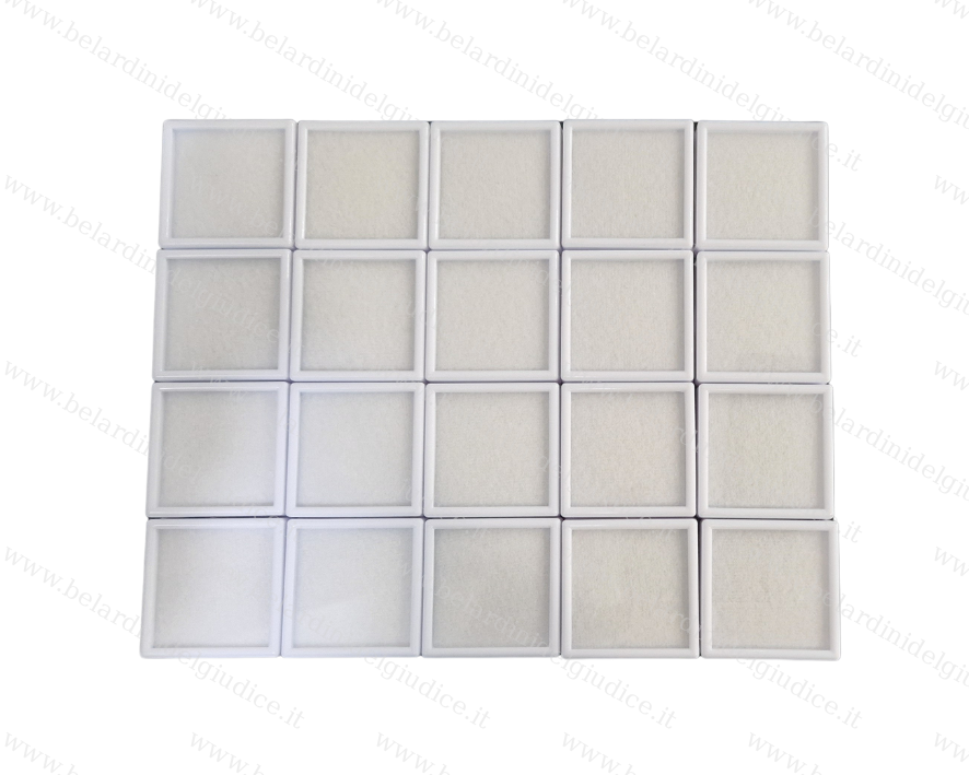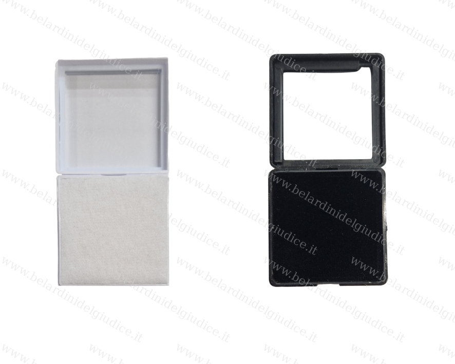 Scatoline formato quadrato in plastica e vetro. Interno in gommapiuma soffice per ospitare pietre di varia caratura.