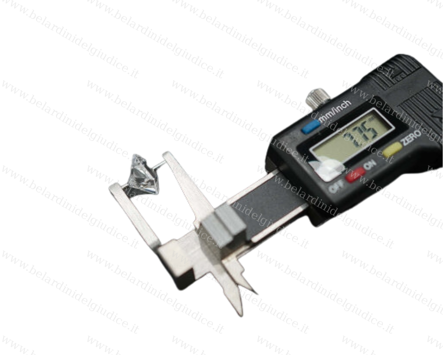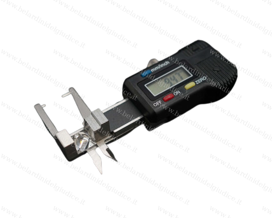 Strumento progettato per la misurazione di pietre preziose montate o libere con display ad indicazione digitale LCD, divisione di lettura 0.01 mm apertura da 0 a 20 mm.