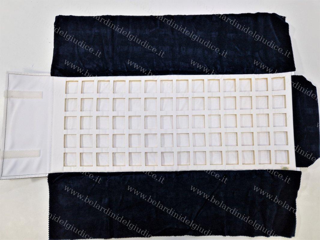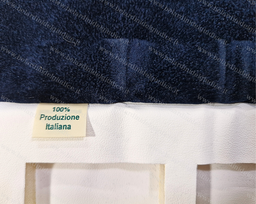 Realizzato in tessuto maya color blu, con gli interni in similpelle bianco e le alette in tessuto floccato color blu e con caselle in gommapiuma.