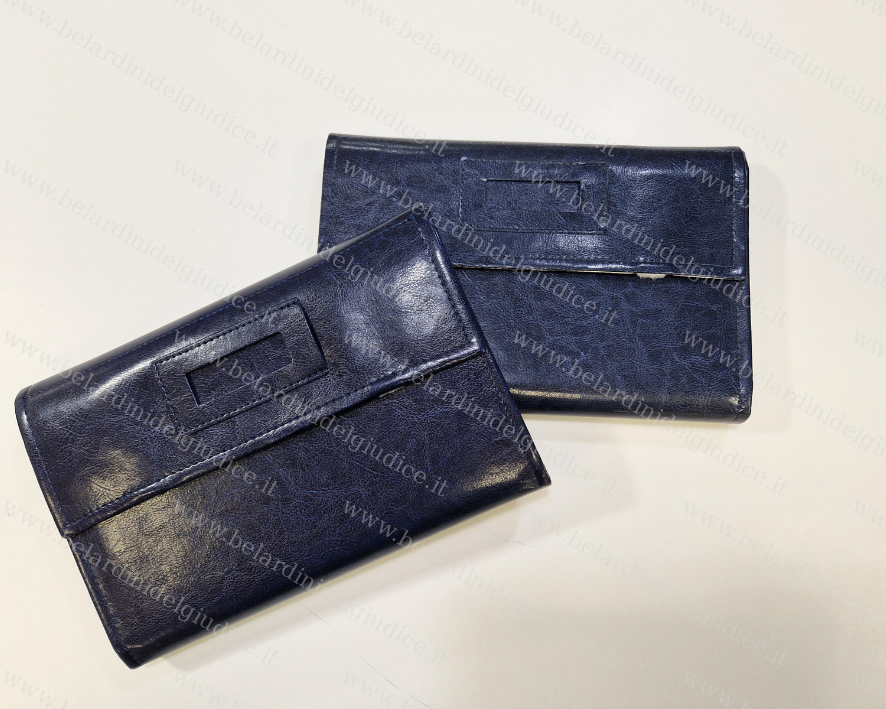Realizzato in similpelle maya color blu, con gli interni bianchi e le alette in tessuto floccato color blu con 4 ante con lacci per collier.