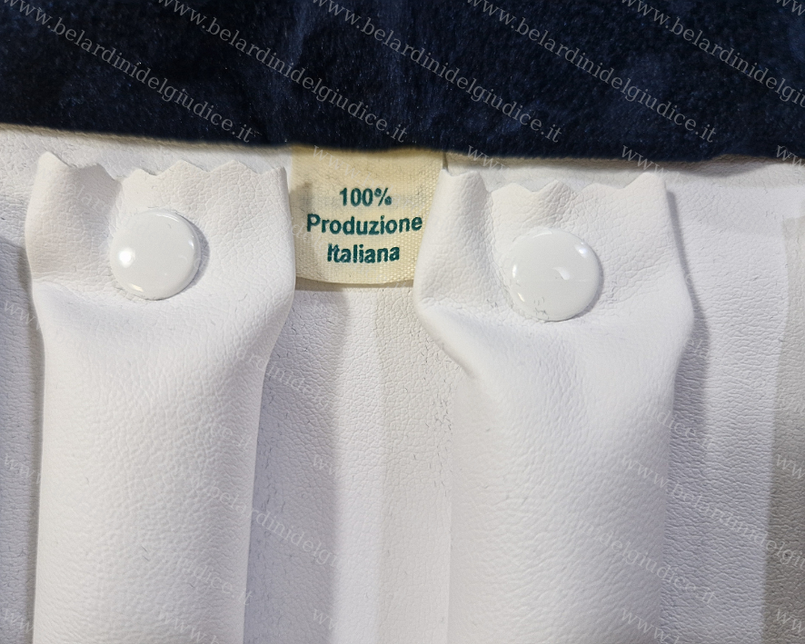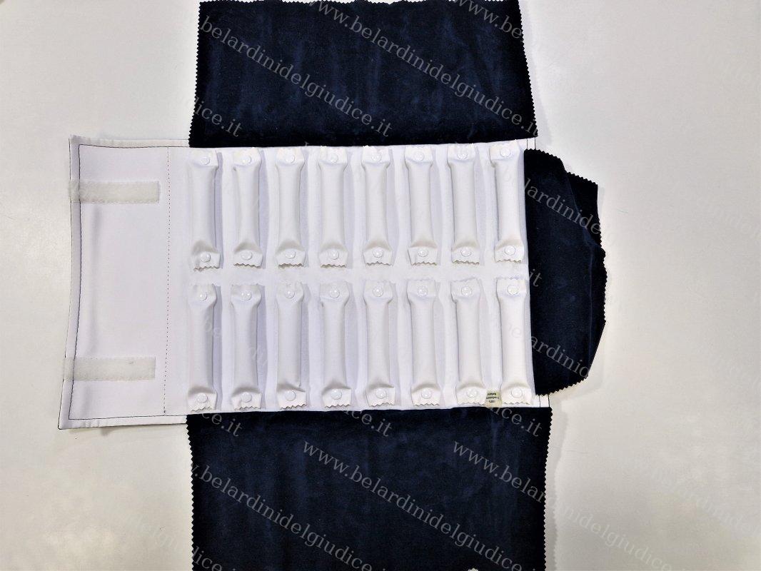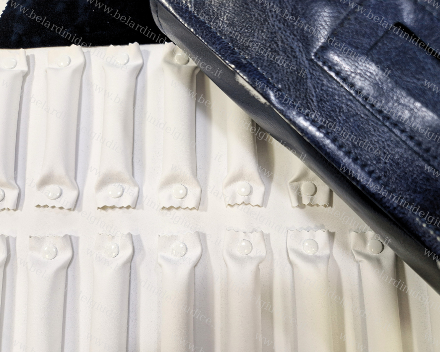 Realizzato in similpelle maya color blu, con gli interni bianchi e le alette in tessuto floccato color blu a 2 file da 8 rulli per anelli.