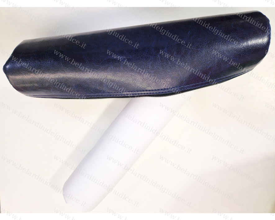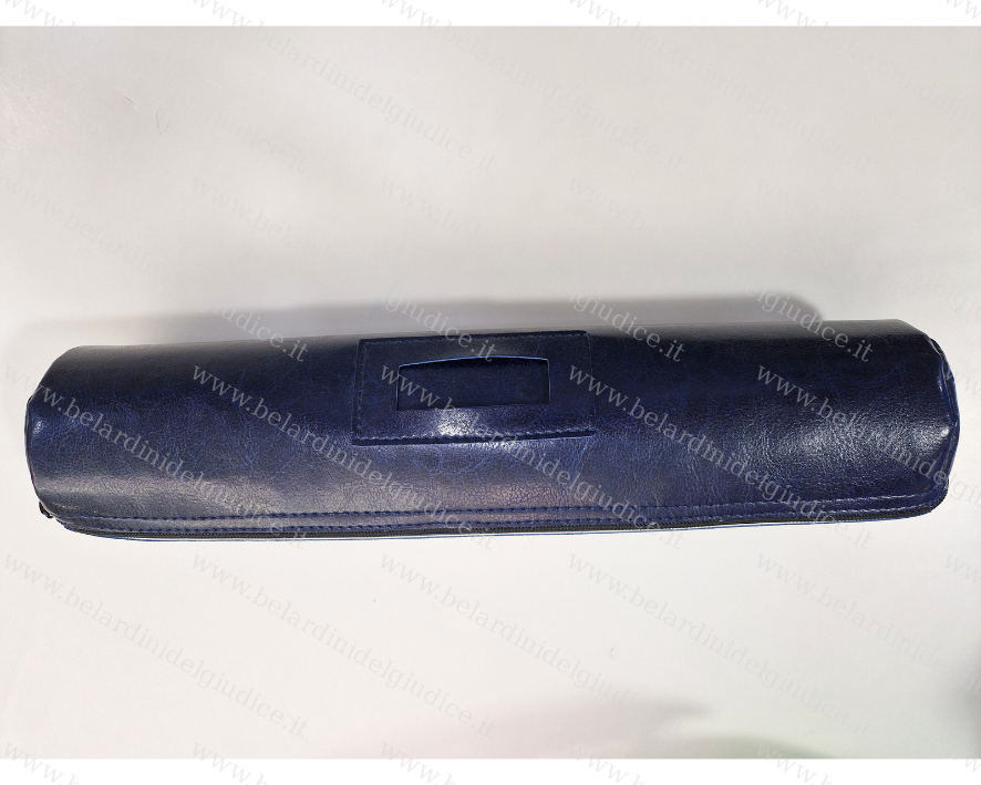 Realizzato in similpelle maya color blu, con gli interni bianchi e le alette in tessuto floccato color blu. A forma di tubo per bracciali L. 32 cm
