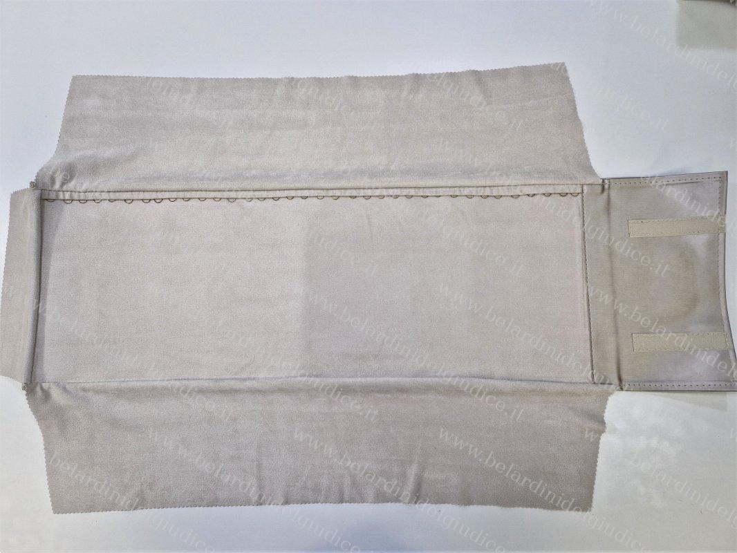 Questo rotolo è stato realizzato in similpelle setificata Lucerne color chiampagne, con gli interni e le alette in microfibra ultraleggera color avorio.