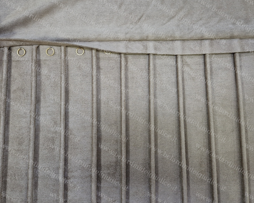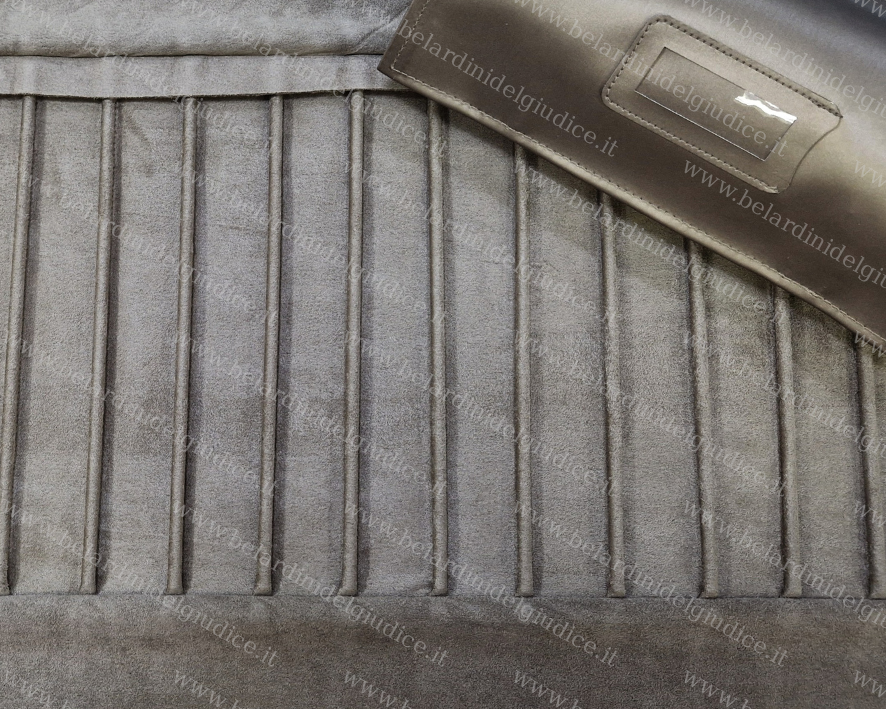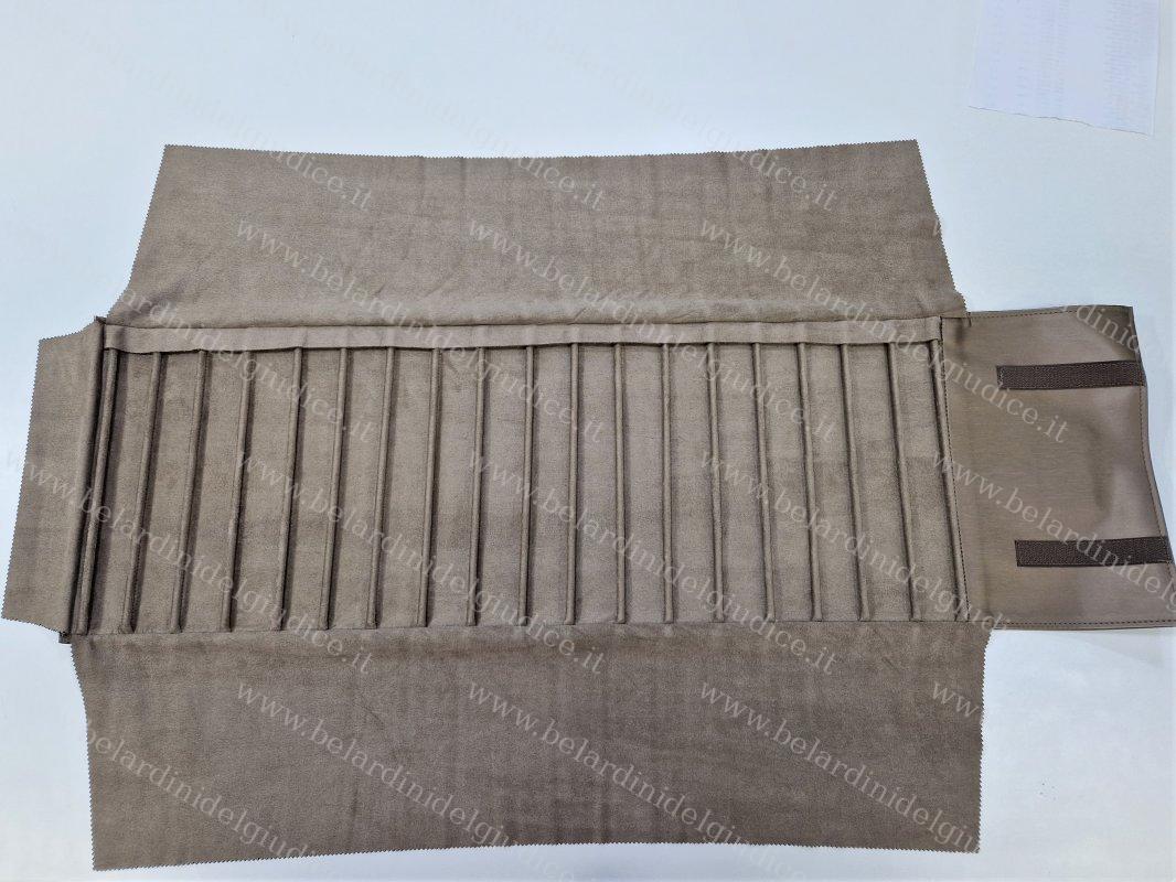 Questo rotolo è stato realizzato in similpelle setificata Lucerne color bronzo, con gli interni e le alette in microfibra ultraleggera color quercia.
