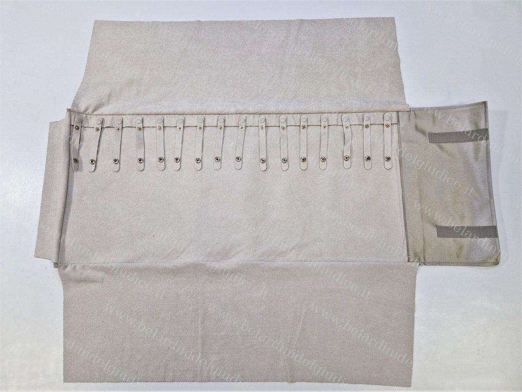 Questo rotolo è stato realizzato in similpelle setificata Lucerne color chiampagne, con gli interni e le alette in microfibra ultraleggera color avorio.