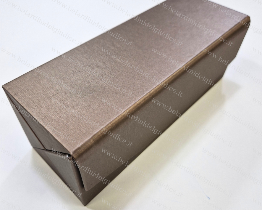 Questo tartufo è stato realizzato in similpelle setificata Lucerne color bronzo, con gli interni e le alette in microfibra ultraleggera color quercia.