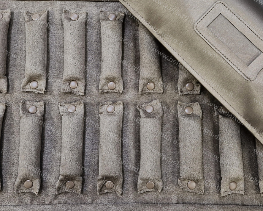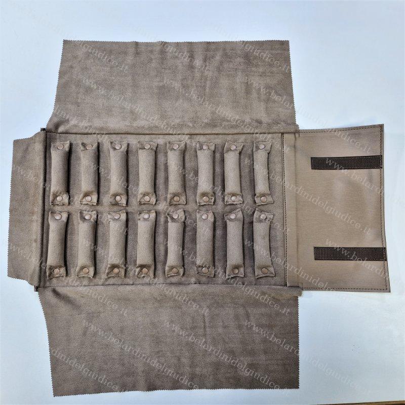 Questo rotolo è stato realizzato in similpelle setificata Lucerne color bronzo, con gli interni e le alette in microfibra ultraleggera color quercia.