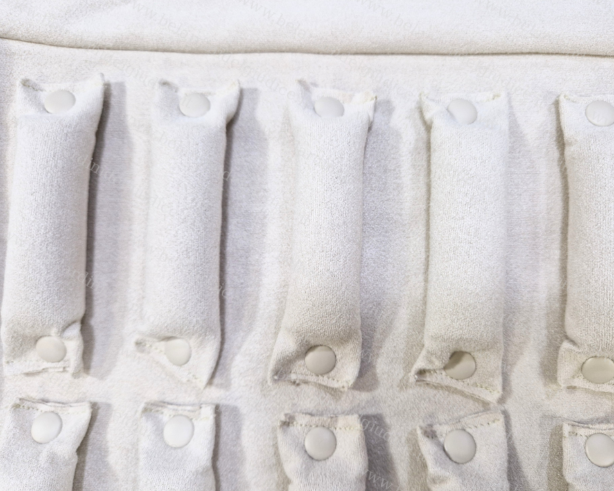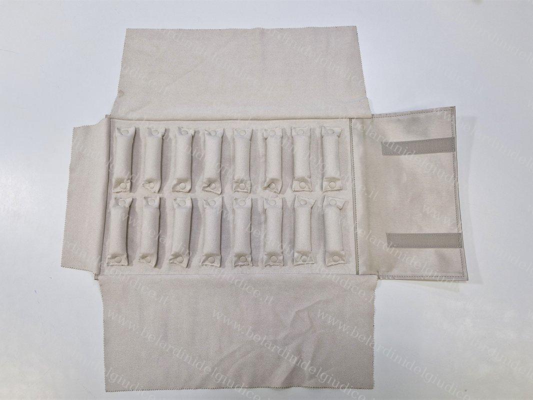 Questo rotolo è stato realizzato in similpelle setificata Lucerne color chiampagne, con gli interni e le alette in microfibra ultraleggera color avorio.