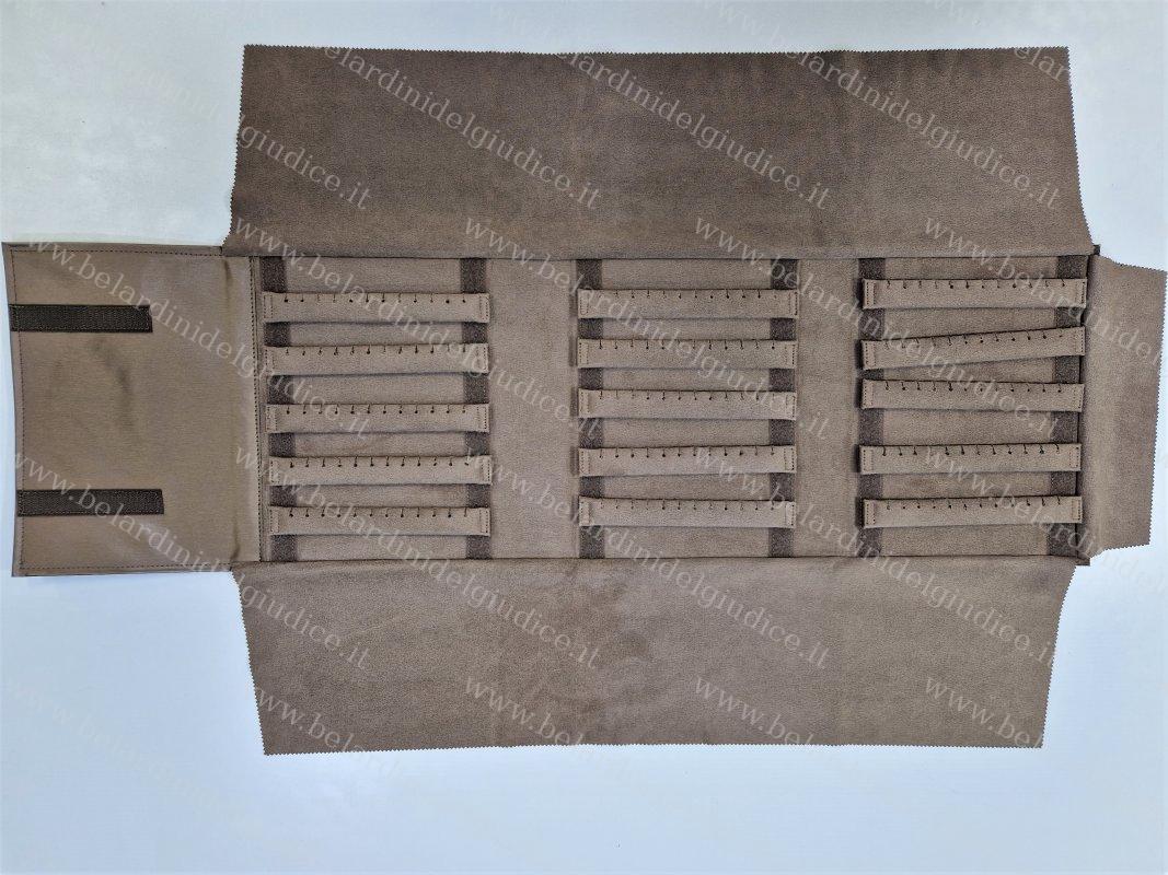 Questo rotolo a 3 ante è stato realizzato in similpelle setificata Lucerne color bronzo, con gli interni e le alette in microfibra ultraleggera color quercia.
