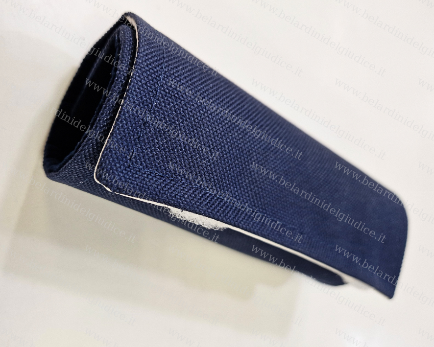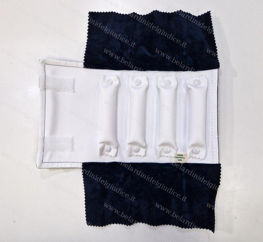 Rotolo mini realizzato all'esterno in tessuto tecnico tipo cordura di color blu, con gli interni bianchi e le alette in tessuto floccato color blu.