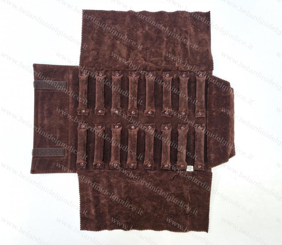 Realizzato in similpelle stampa alligatore color testa di moro, con gli interni e le alette in tessuto floccato color marrone a 2 file da 8 rulli per anelli.