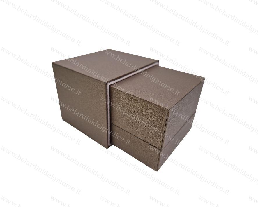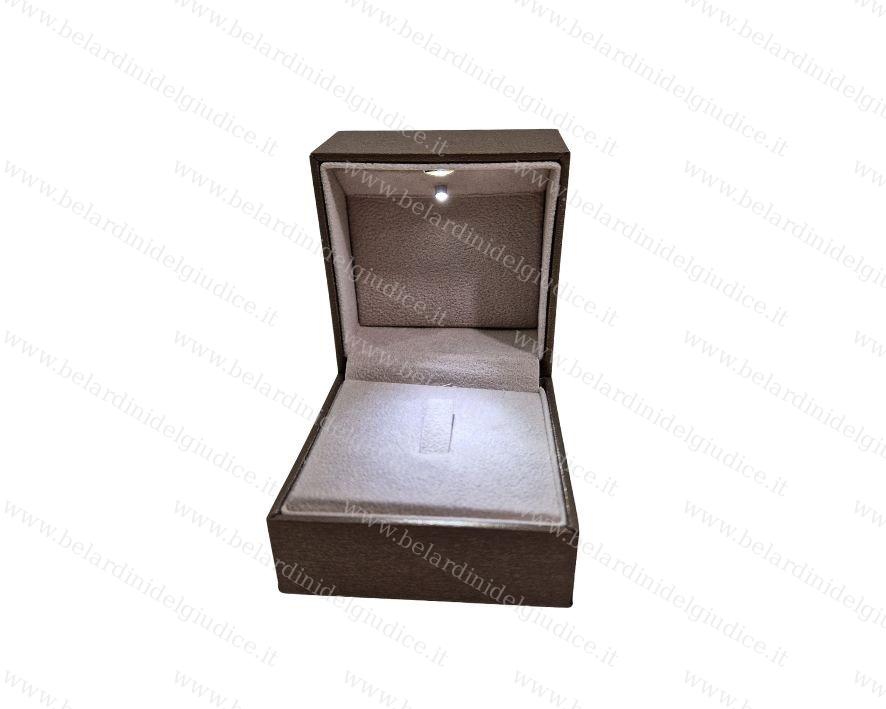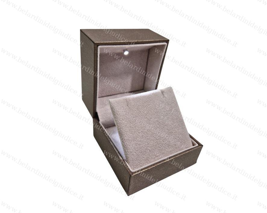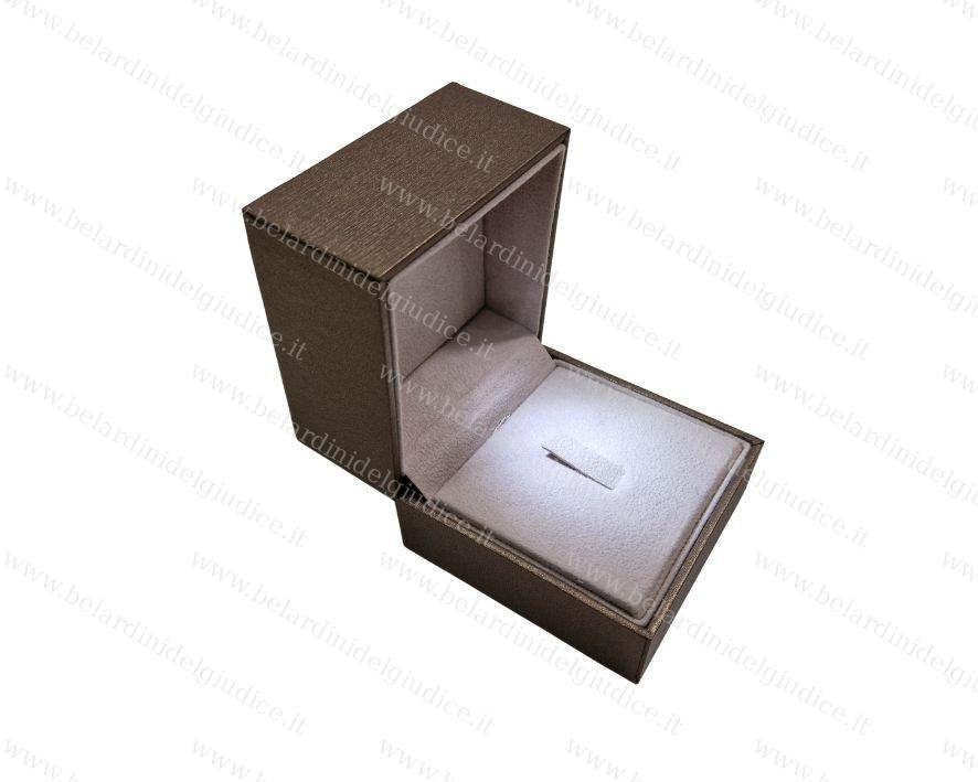 Astuccio color bronzo con esterno in cartonato e interni in tessuto floccato. Con luce inclusa.