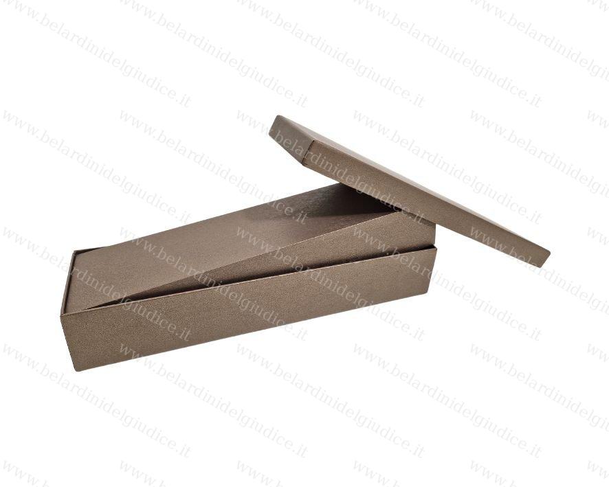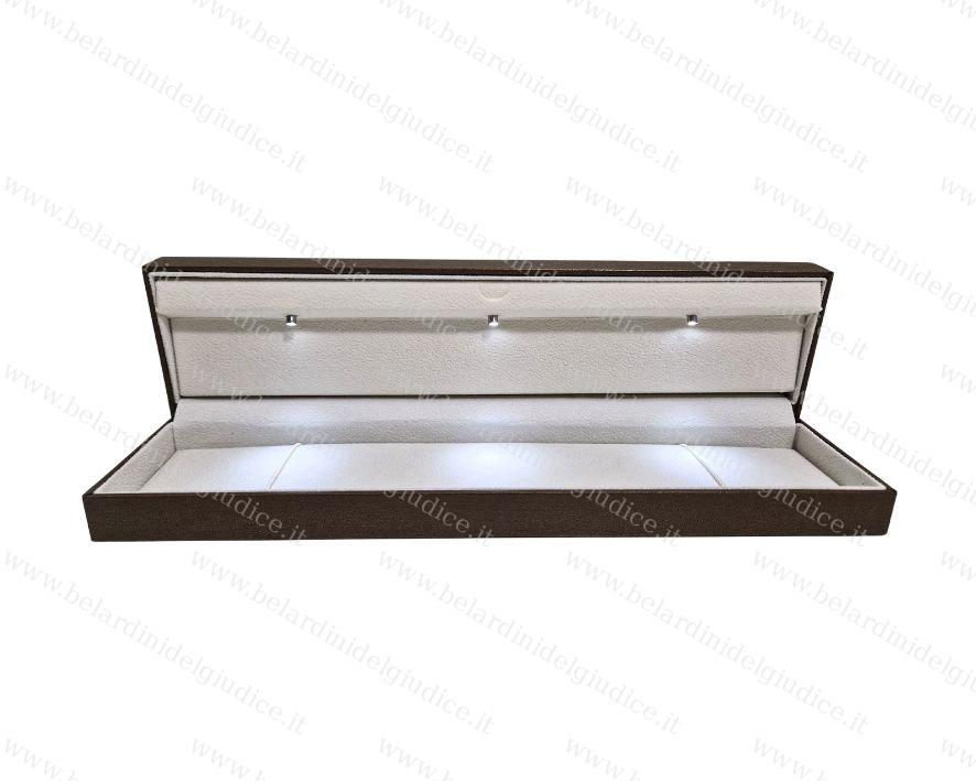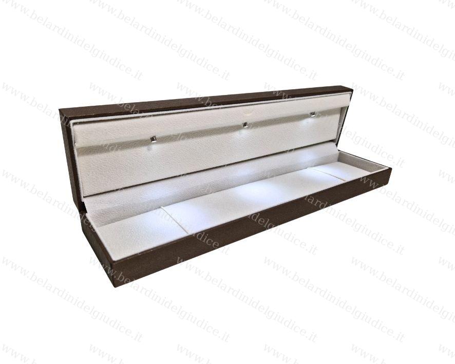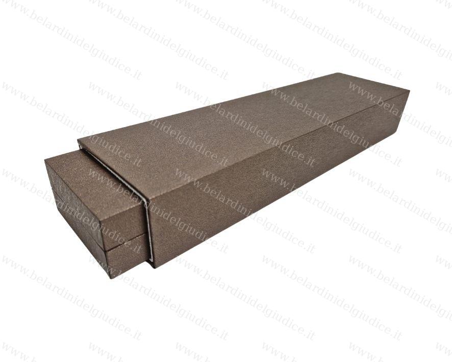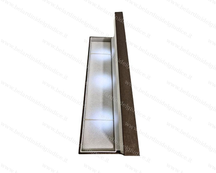 Astuccio color bronzo con esterno in cartonato e interni in tessuto floccato color panna. Con luce inclusa.