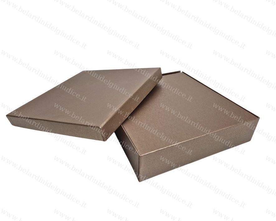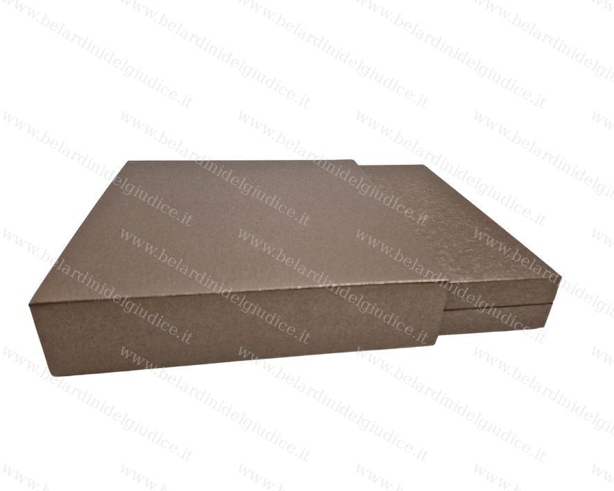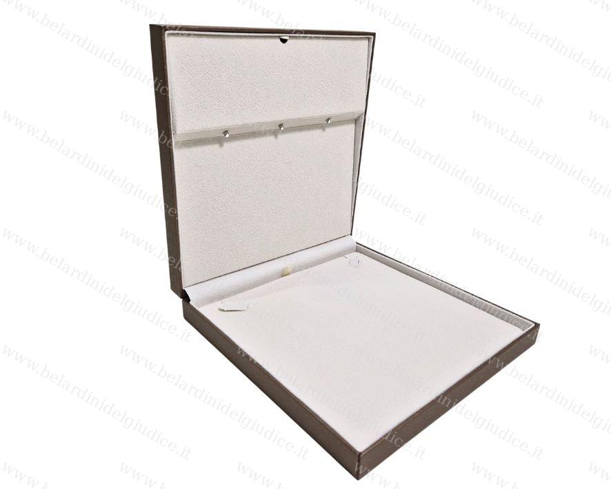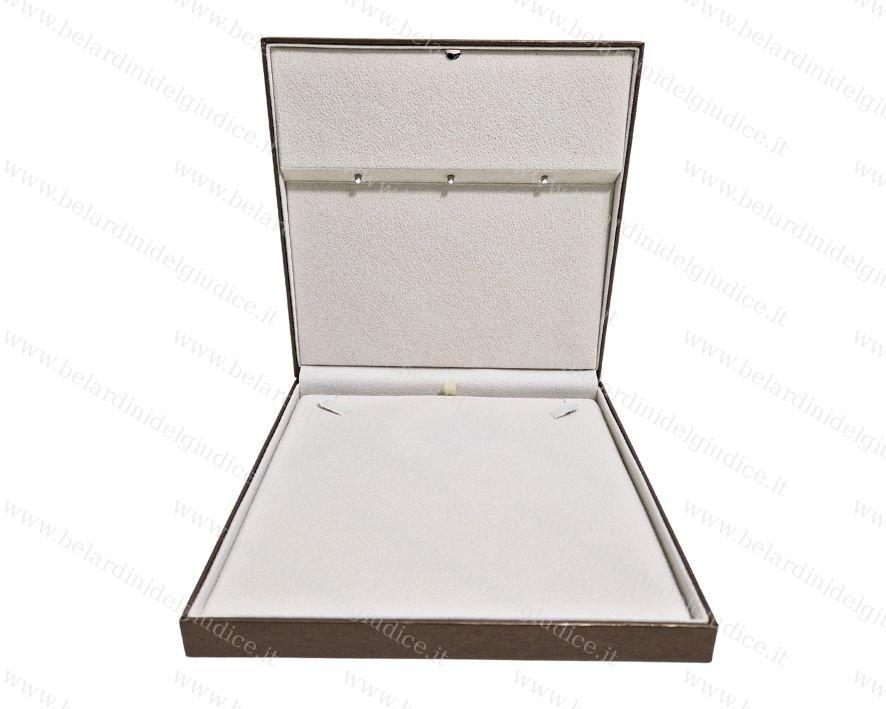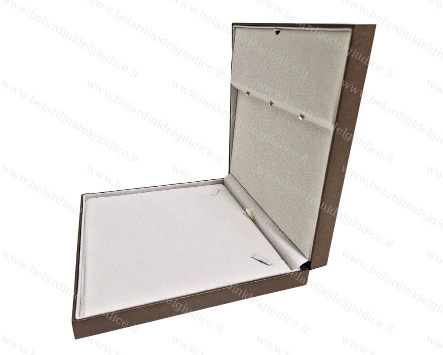 Astuccio color bronzo con esterno in cartonato e interni in tessuto floccato color panna.