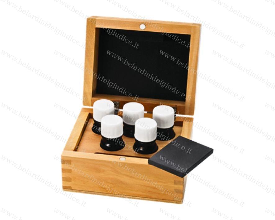 Scatola in legno con 5 flaconi per saggi + 1 pietra paragone