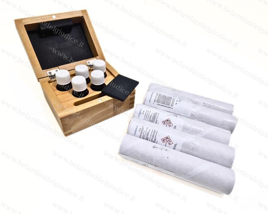 Set per saggi: Scatola con 5 flaconi + 5 acidi + pietra