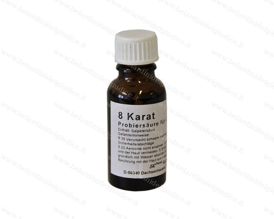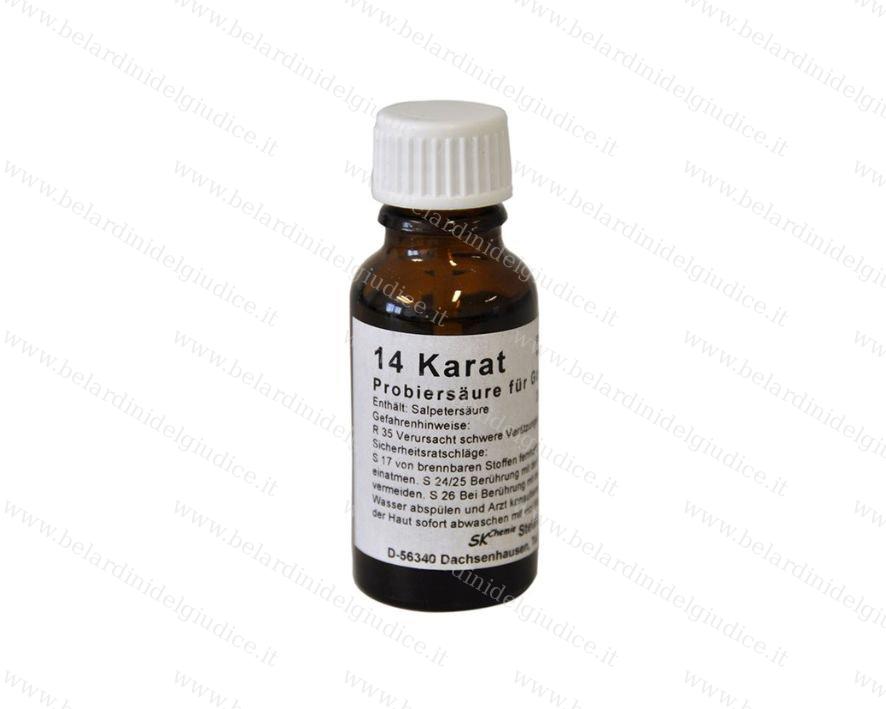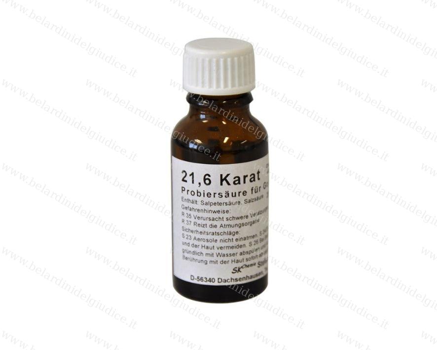 Acido reagente per oro 8, 14, 18 e 21,6 kt in boccetta a gocce con paletta forata.