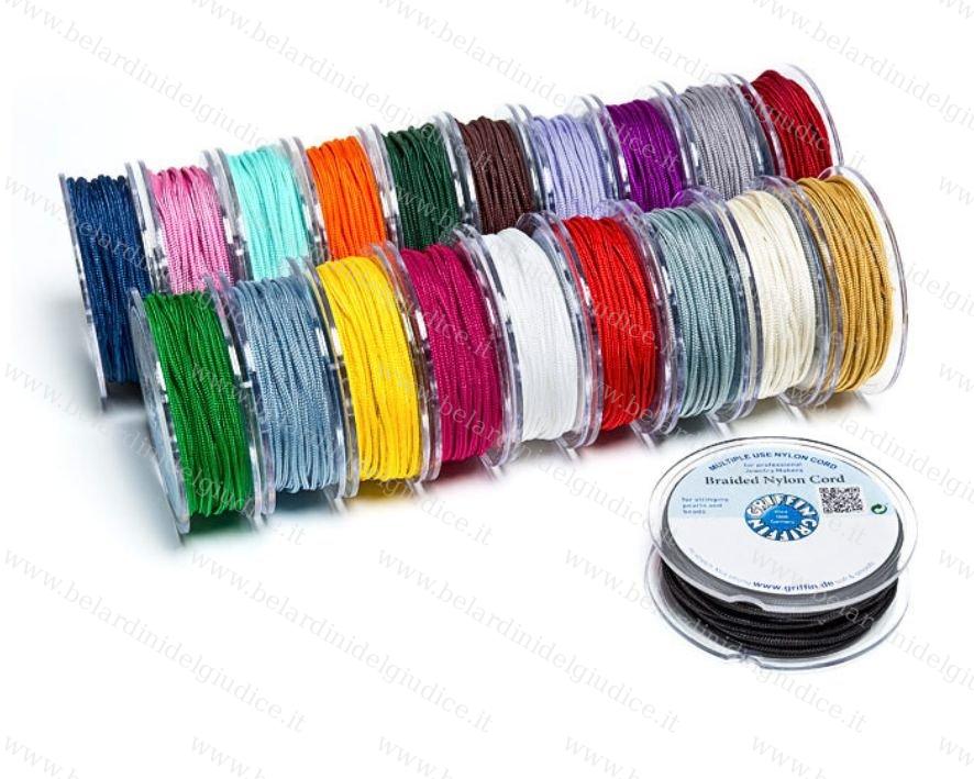 Il cordoncino di nylon intrecciato su bobine della Griffin è una corda con guaina ad intrecciatura circolare poco elastica e leggera. Il materiale è il nylon, materiale molto forte, resistente alla rottura ma al tempo stesso morbido, flessibile, adattabile e piacevole al contatto con la pelle.