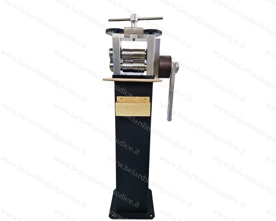 Questo laminatoio di ridotte dimensioni è perfetto per essere posto su apposta colonna. Presenta due cilindri (rulli) - mezzalastra e mezzofilo - e roulettes filo mezzotondo.