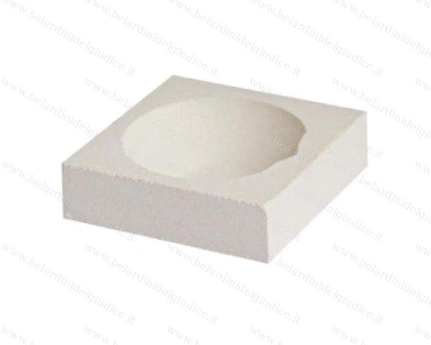 Crogiolo in materiale ceramico refrattario di forma quadra con cavità concava e bocchetta di scolo.