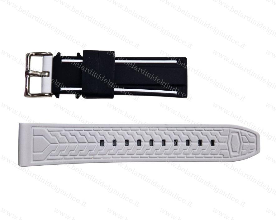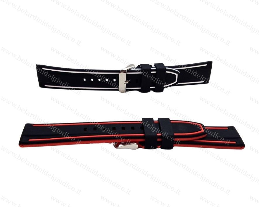 Cinturino in silicone bicolore con fibbia in acciaio e fermapassante.
