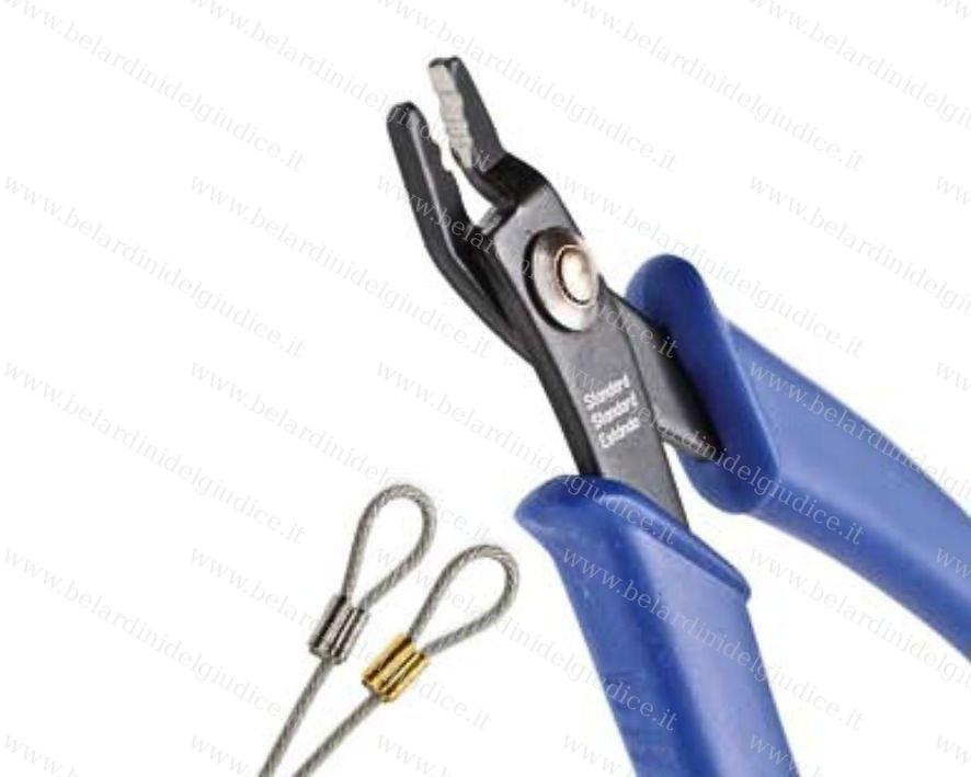 Questa pinza presenta una doppia scanalatura per schiacciare e piegare gli schiaccini. Ciò serve per realizzare una forma il più ottimale possibile per il serraggio del filo.